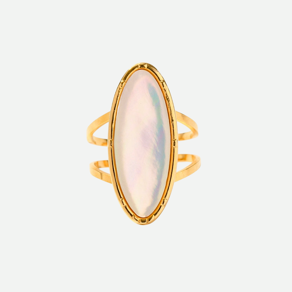 Elegant and luminous, the Aurora Ring features a natural white shell set in a smooth, oval bezel. Its reflective surface catches the light beautifully, perfect for elevating day and evening looks. A minimal yet eye-catching piece that feels timeless.